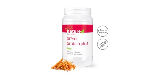 Protein-Konzentraten aus Erbsen und Hafer sowie dem Vitalpilz Cordyceps sinensis vereint premi protein plus gleich drei hochwertige Eiweissquellen – und alle essentiellen Aminosäuren. Neben dem für Veganer besonders wichtigen Lysin bietet es jede Menge L-Glutamin und eine Extraportion L-Glycin. Dank Vitamin C aus der Acerolakirsche unterstützt premi protein plus  zusätzlich Immunsystem und Kollagenbildung, verleiht dem Stoffwechsel frische Energie und fördert sogar die gerade bei pflanzenbasierter Ernährung so wichtige Eisenaufnahme. Abgerundet wird die ausgefeilte Mischung durch Hagebuttenpulver, Zimt und Kurkuma als pflanzliche Partner, den Ballaststoff Inulin aus der Zichorienwurzel sowie Taurin und L-Carnitin.
