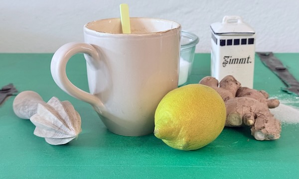 So geht's: Etwa zwei gute Zentimenter einer Ingwerwurzel fein reiben. Drüber kochendes Wasser gießen. Mit dem Wasser die Ingwerreste von der Reibe in die Tasse waschen. Den Saft einer halben Zitrone dazu geben. Mit einer großzügigen Messerspitze Ceylon-Zimt verquirlen. Und mit Glyzin süßen. Glycin – eine süß schmeckende Aminosäure – optimiert die Bildung von Kollagen. Hilft der Leber bei Entgiften. Senkt Insulin, stärkt das Immunsystem, beruhigt die Nerven. Glycin ersetzt kalorienarm und glyxniedrieg den Zucker im Tee oder Kaffee, allerdings nicht mehr als 1 TL nehmen!